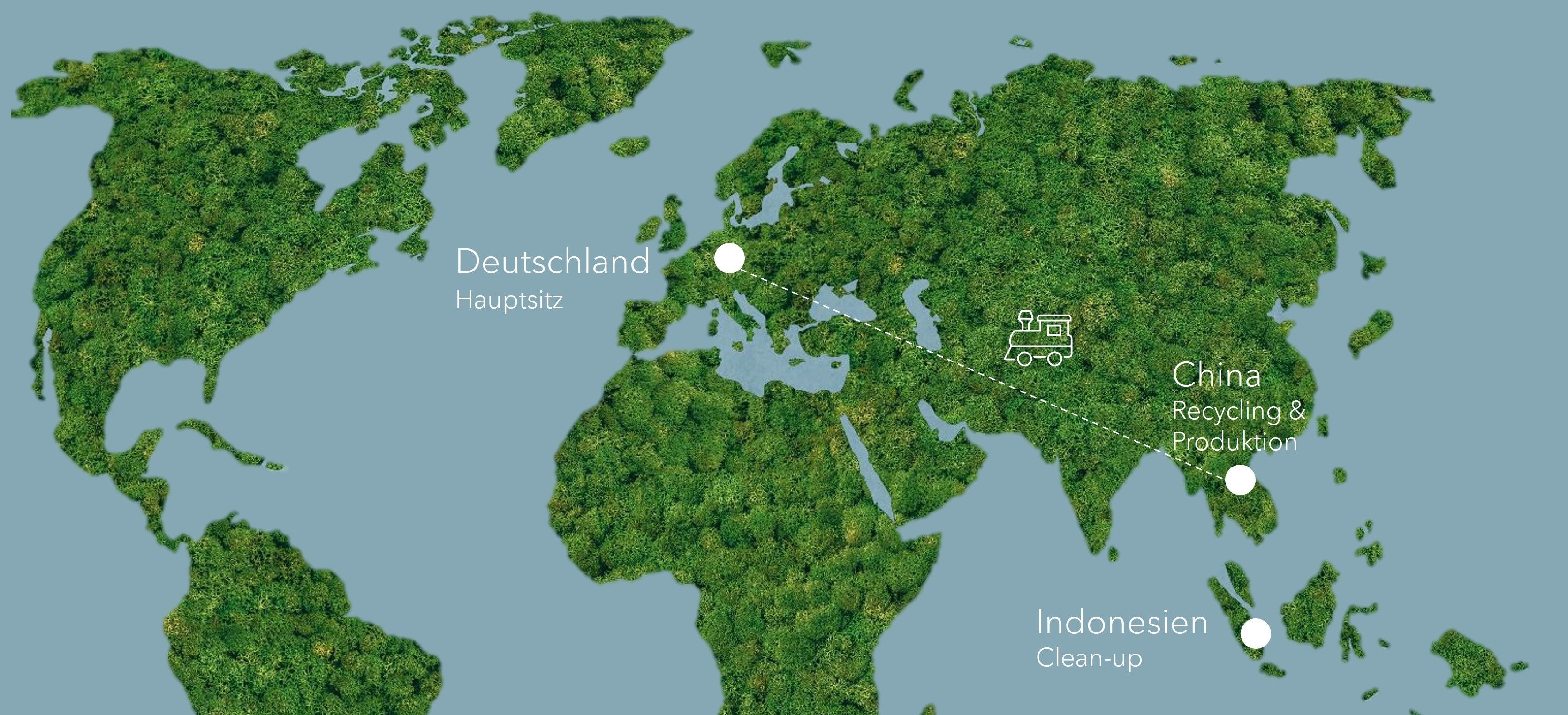 Der Indische Ozean ist am stärksten von Plastikverschmutzung und seinen Konsequenzen betroffen. Wer bereits Urlaubsparadiese wie Bali besucht hat, weiß wie akut dieses Problem ist. Und genau dort setzen wir an. Das Ozean Plastik wird hauptsächlich in Indonesien gesammelt. Unsere Produktion findet in China statt. Hier haben wir gewachsene Partnerschaften etabliert und auch für das Thema Plastikrecycling Bewusstsein geschaffen. Für den Transport nutzen wir ausschließlich die Bahn.